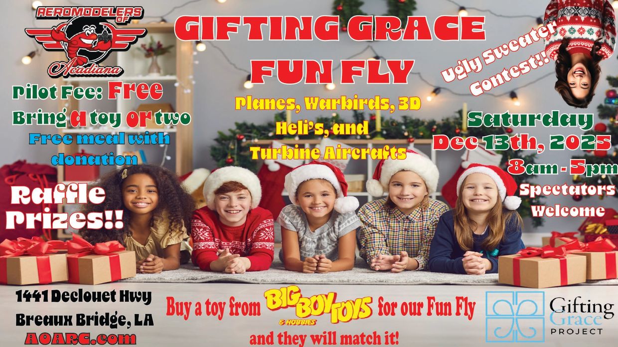 We will be hosting our 2nd Annual Gifting Grace Fun Fly on Dec. 13th, 2025 from 8am-5pm. There's NO pilot fee. Just bring an unopened toy or two or more. Valued at $20 or more if possible. (5 Free raffle tickets with every donation) If you can't and would like to donate money that is fine as well.