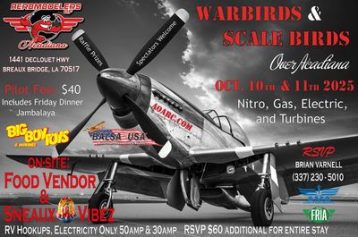 Our Warbirds and Scale Birds - Oct. 10th & 11th 2025 Gas, Nitro, EDF and Turbines. Spectators welcome. Fly over 200 acres of no obstructions. 850' x 100' Rolled Grass Runway.